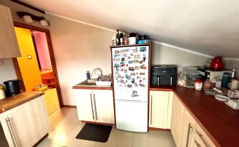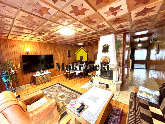 Salon z aneksem kuchennym (płyta indukcyjna z okapem, lodówka, zlew). W centralnej części kominek - salon i wyjście na taras.